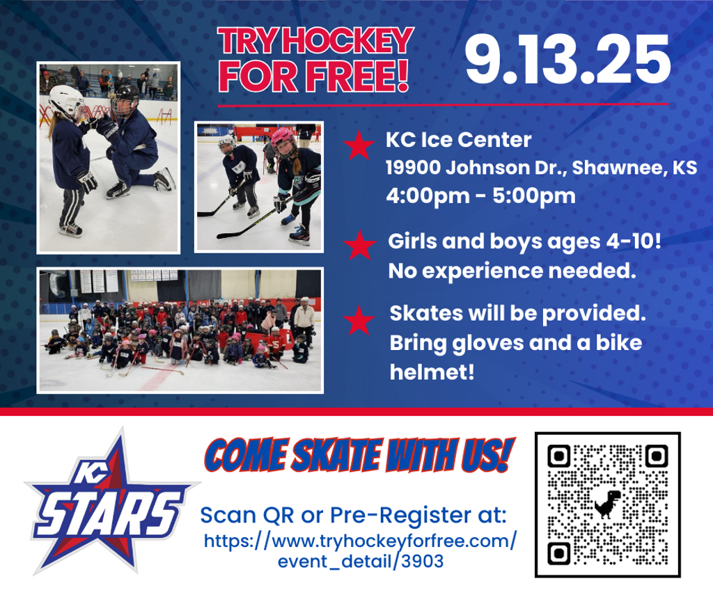Try Hockey For Free on Sat., Sept. 13, 2025 from 4:00-5:00pm at KC Ice Center in Shawnee, KS. For boys and girls Age 4-10. No skating experience needed. Bring a bike helmet and gloves. Pre-register at the following link.